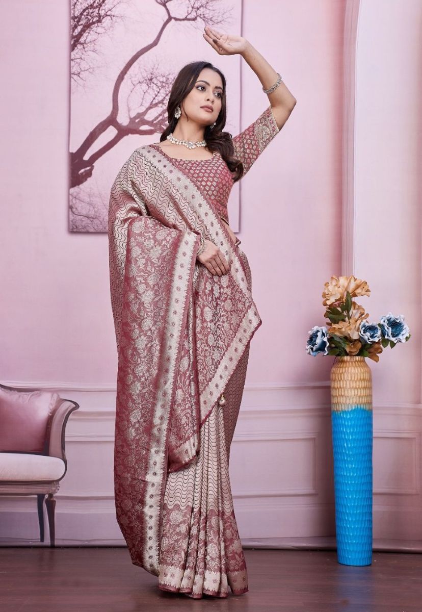 Troika Fashion β Rose Pink HO Silk Saree with Golden Zari Floral Work & Elegant Borders