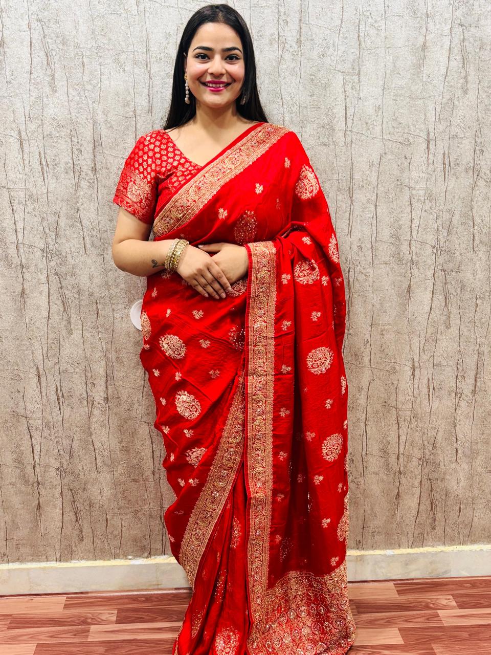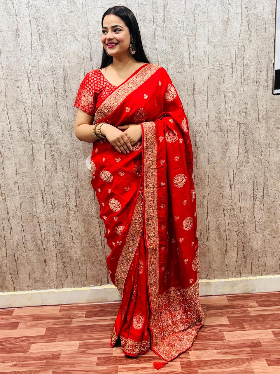 Celebrate your special moments with this exquisite Pure Dola Silk Saree, crafted to perfection with intricate handwork. The rich red hue combined with delicate detailing makes it the perfect choice for weddings, parties, and festive occasions. Its luxurious drape and timeless elegance ensure you shine with confidence and grace.