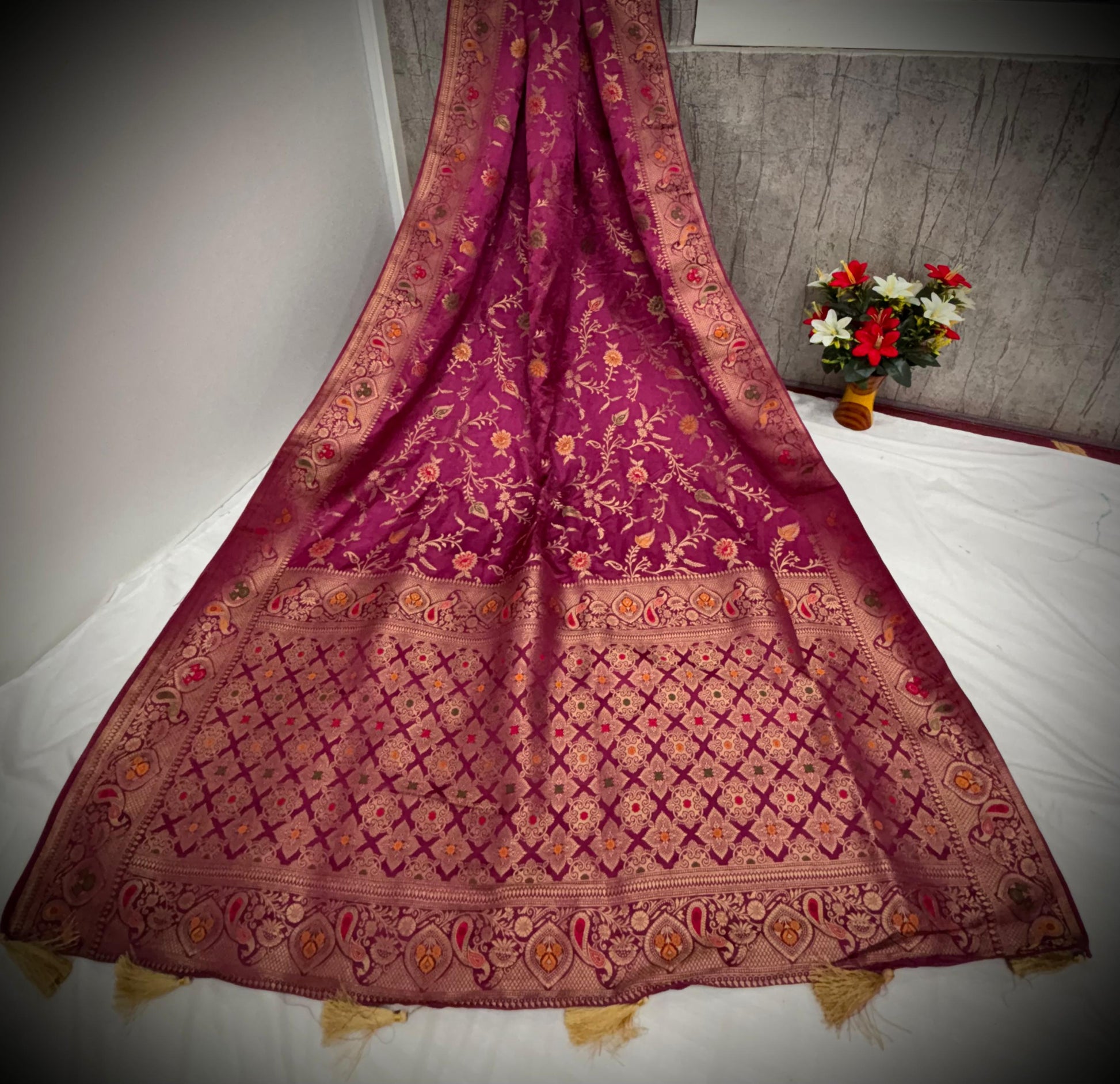 Magenta Satin Saree with Multicolor Floral Weaving & Ornate Borders