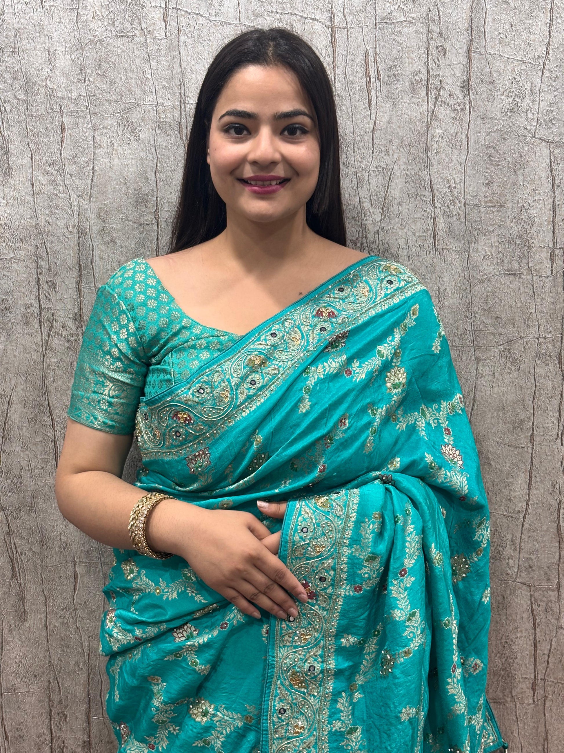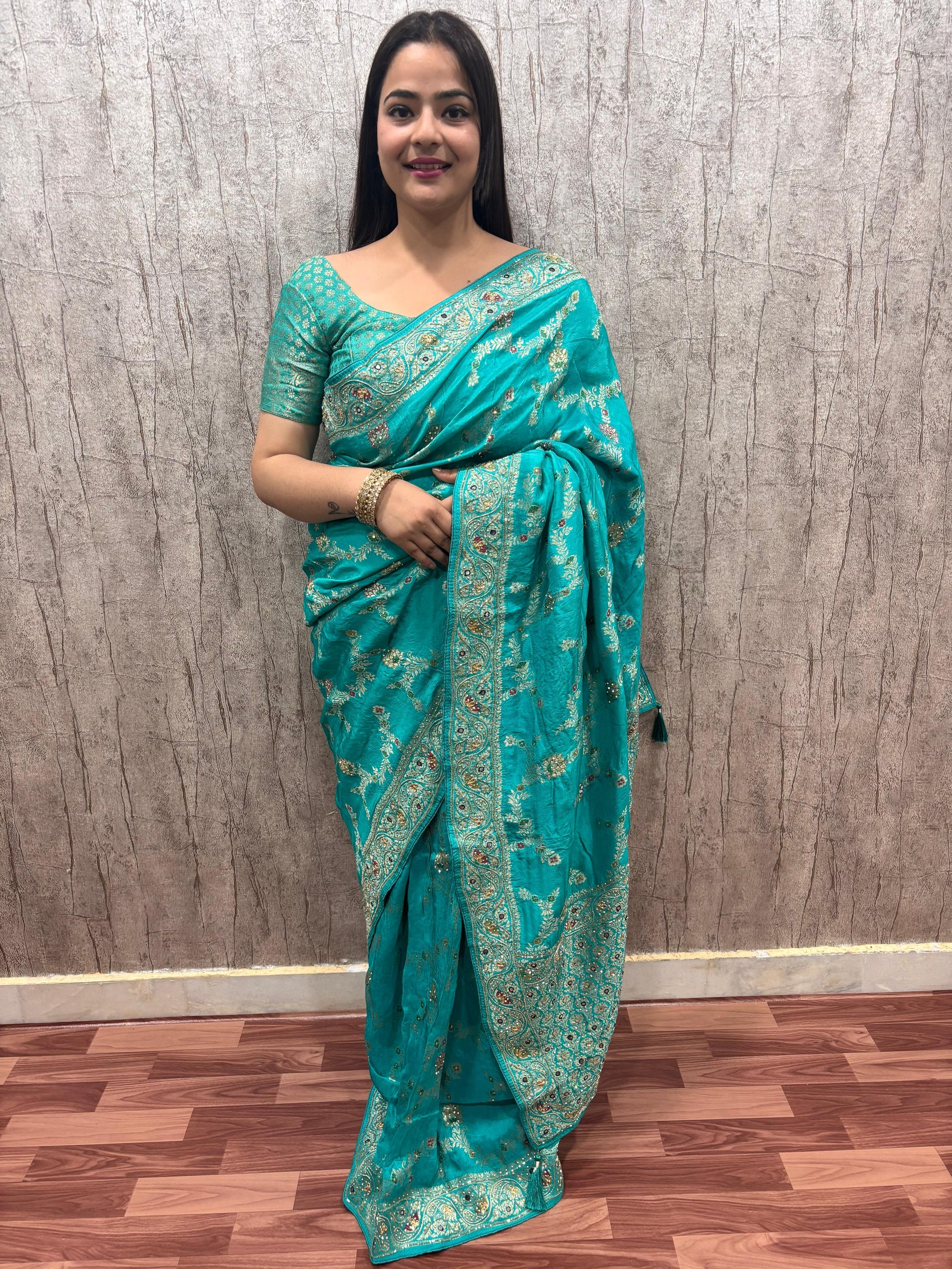 Troika Fashion β Elegant Teal Pure Dola Silk Handwork Saree