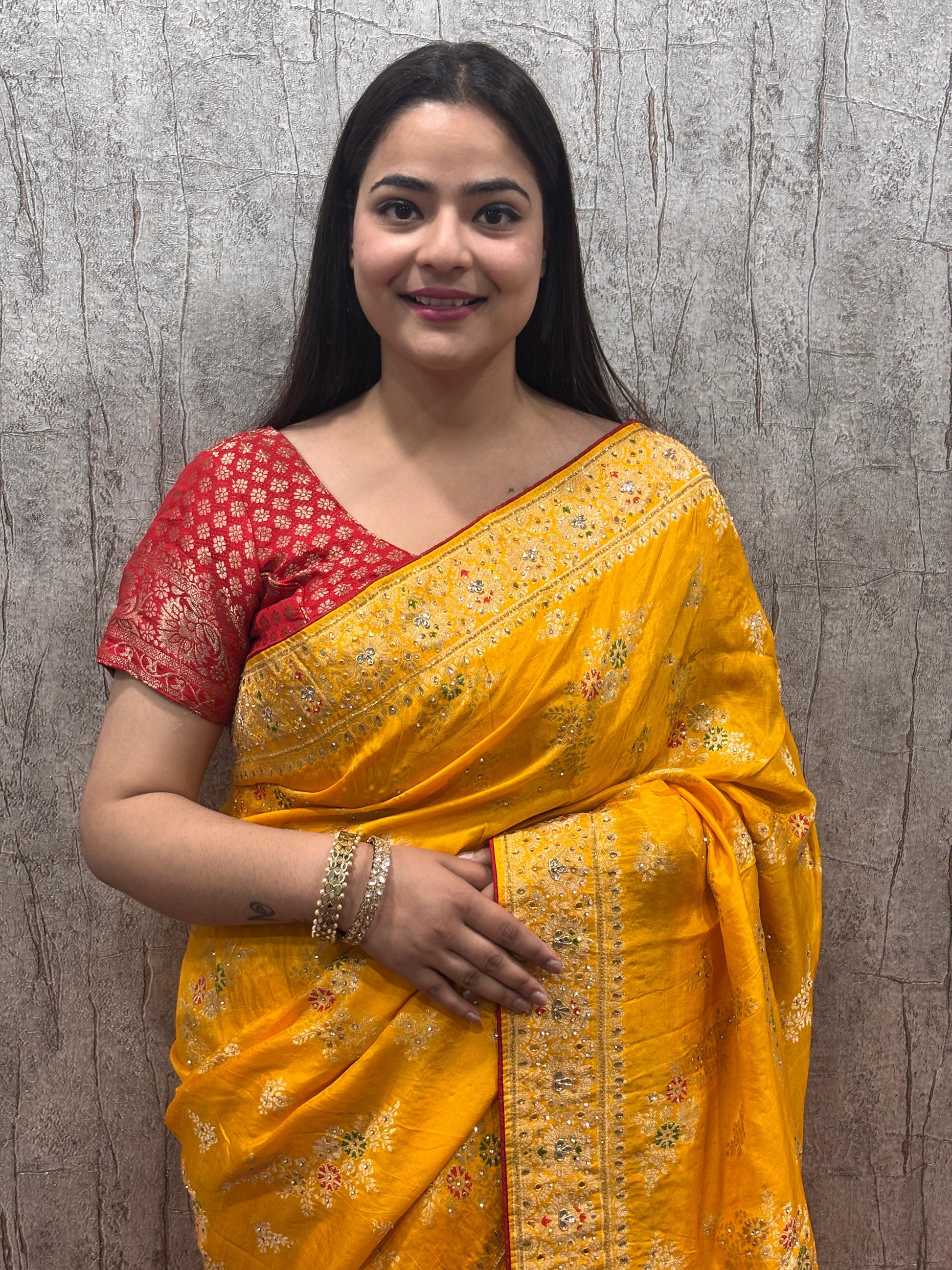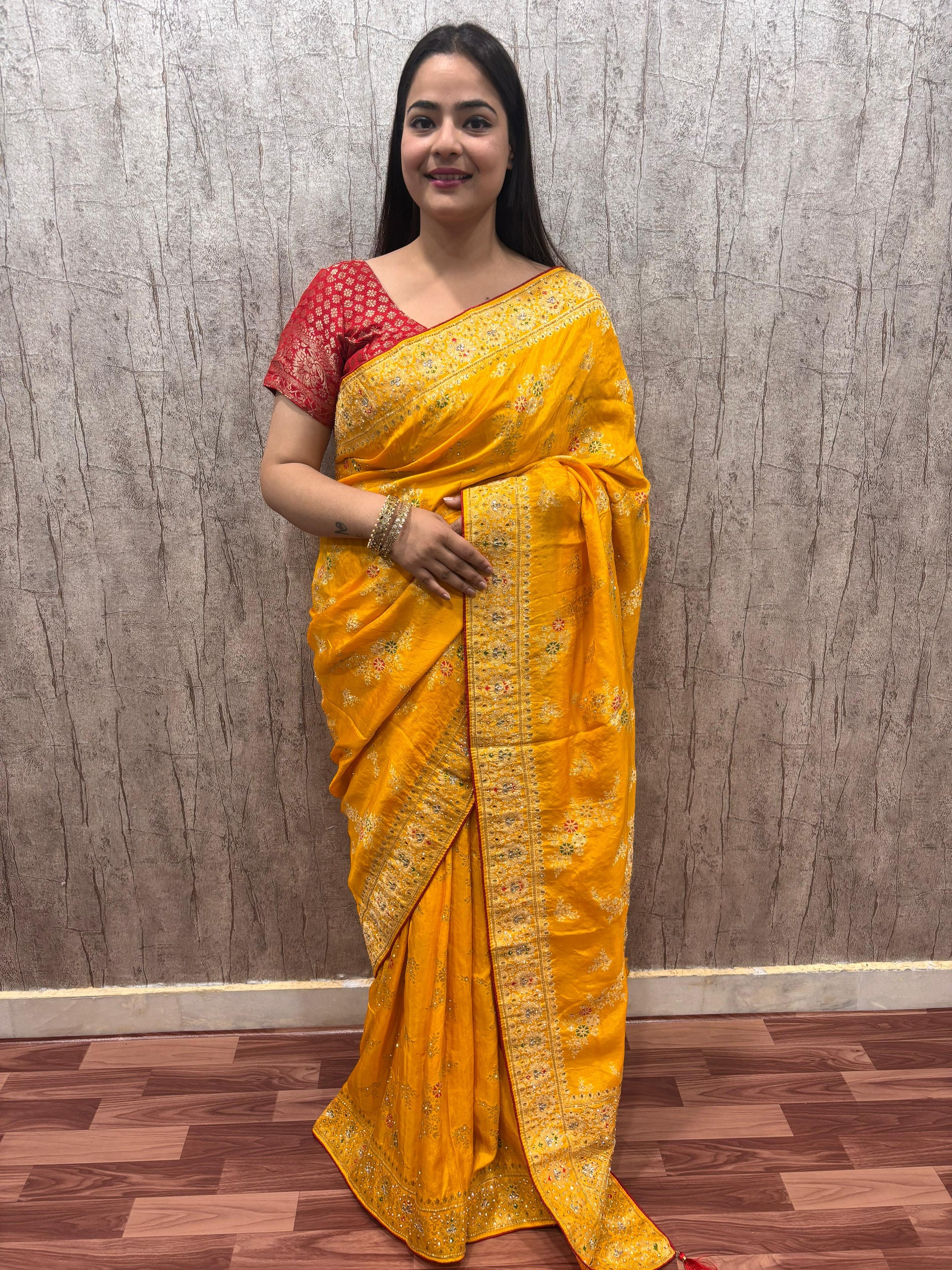 Radiate elegance with this Pure Dola Silk Handwork Saree, designed to make you the center of attention at every celebration. The vibrant mustard yellow hue symbolizes joy and festivity, while the delicate hand embroidery adds richness and sophistication. Perfect for weddings, festive occasions, and grand parties, this saree blends tradition with timeless charm.