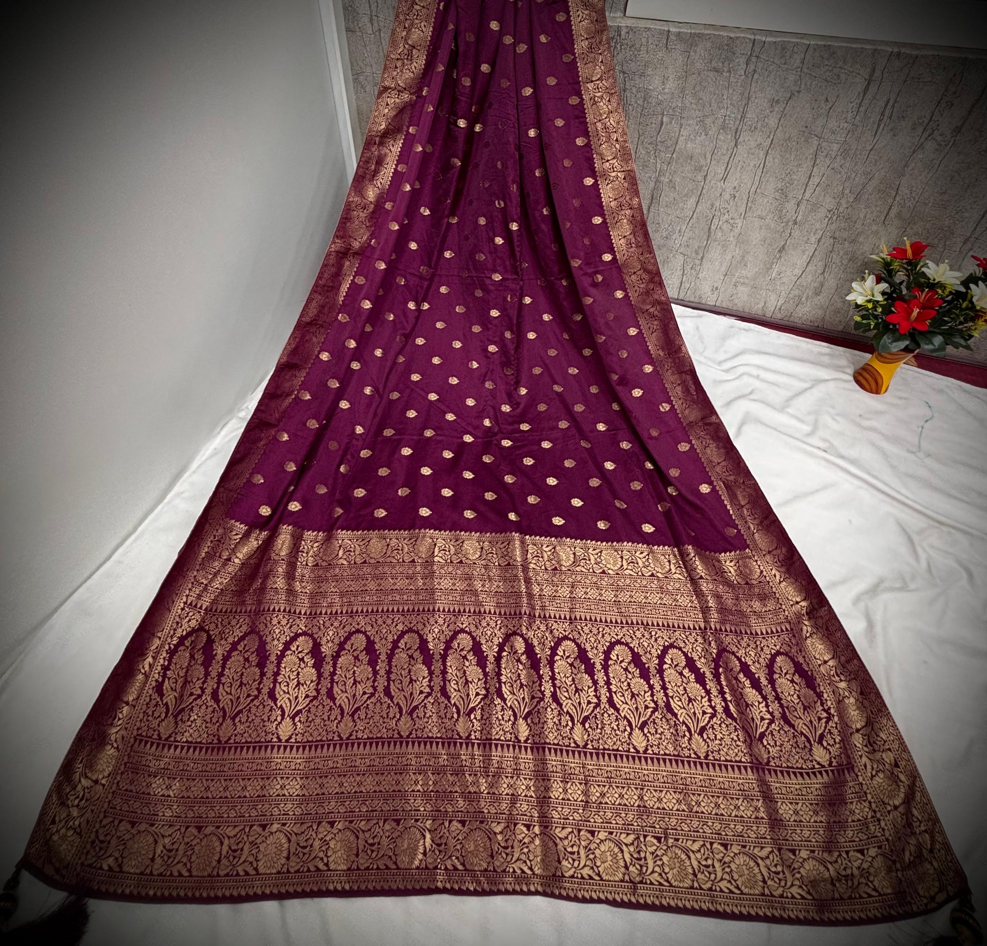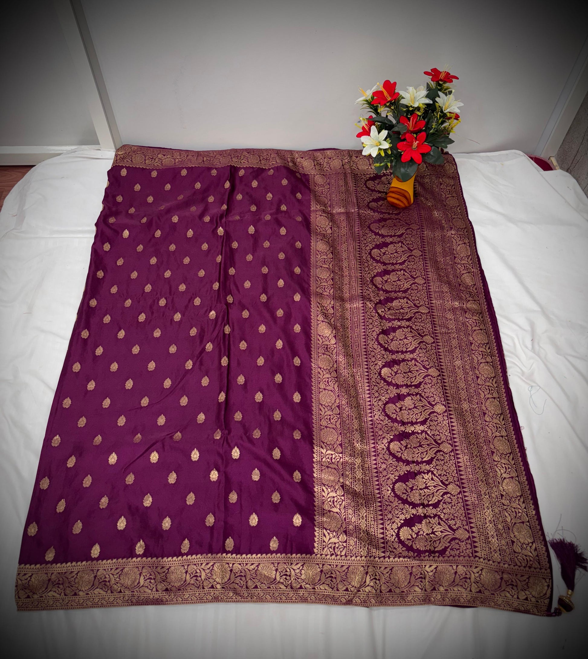 Elevate your festive wardrobe with this Royal Purple Satin Saree, adorned with luxurious golden zari weaving. The intricate floral and paisley motifs across the border add richness, while the elegant buti work throughout the body gives it a timeless royal charm. Perfect for weddings, parties, and festive nights, this saree is designed for women who embrace tradition with sophistication.
